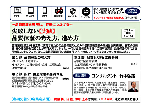 品質(顧客満足)を安定的に実現するための品質保証の仕組みや品質改善活動の取組みを再構築し、顧客の信頼感・安心感を勝ち取ることが不可欠です。本セミナーでは品質保証の本質への理解を深め、品質保証の考え方を再確認し、そのうえで、自社の品質保証部門の課題を見つけ、今後について考えるきっかけを提起します。