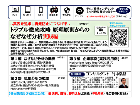 顧客要求がより一層厳しく、品質問題が一度起きると予期せぬ形で信用リスクが波及してしまう環境にあります。経験と勘で表面的に問題をただ処置するだけでは、同じ問題が繰り返されます。本セミナーでは、真因を追求し対策することで再発防止につなげる「なぜなぜ分析」の改善手法・実践の進め方を習得します。また、Mechanism logic Tree/QFDに基づく4軸表活用による根本対策の企業事例も紹介します。
