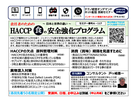 HACCP義務化から2年を経て、ジェネリックな衛生管理計画の模倣から自社事情に対応した自前のHACCP作りが求められています。原料管理対策、異物混入対策、消費(賞味)期限の見直しに焦点を当て、現場での実践に役立つ具体的な方法を提供することで、食品安全に関する意識と知識を高めます。食品の安全観と今日的な品質保証の在り方を理解し、安心・安全な食品づくりとは何か、を考えます。