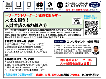 どうしても部下の指導がうまくいかない。職場の雰囲気がなんだか重い。このような悩みをお持ちではないでしょうか?サーバントリーダーシップを身に着けたリーダーは、部下に命令して動かすのではなく、奉仕や支援を通じ、部下を信頼し、協力し合いながら主体的に動く状況を作り出すといったスタイルで組織を動かすことができます。